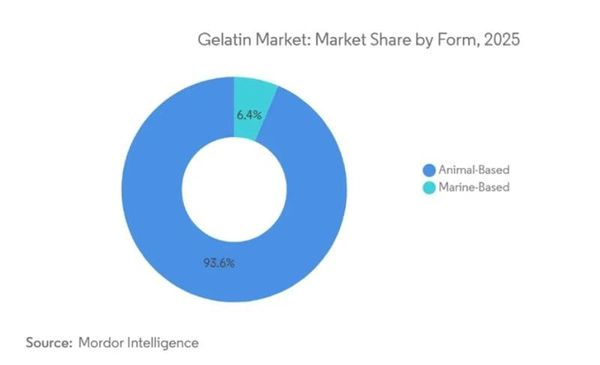 Một điểm đáng lưu ý là dù các sản phẩm thay thế từ thực vật (plant-based alternatives) đang dần xuất hiện, gelatin nguồn gốc động vật (đặc biệt là từ da trâu, bò) vẫn chiếm tỷ trọng lớn với 93,61% thị phần.
