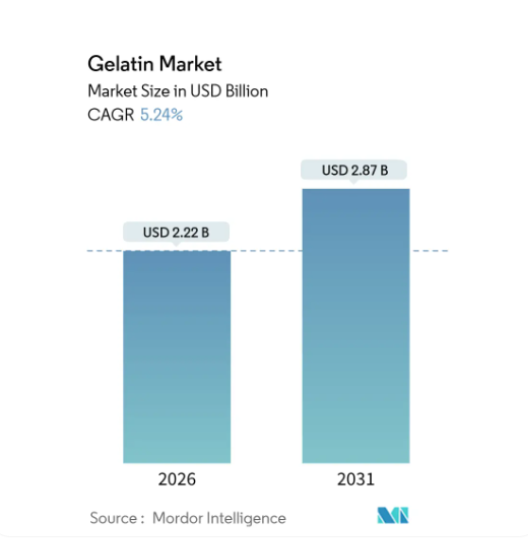 Ngành Gelatin toàn cầu đang chứng kiến những cột mốc phát triển ấn tượng. Theo báo cáo từ Mordor Intelligence (2026), quy mô thị trường dự kiến chạm mốc 2,22 tỷ USD vào năm 2026 và tiếp tục tiến tới 2,87 tỷ USD vào năm 2031.
